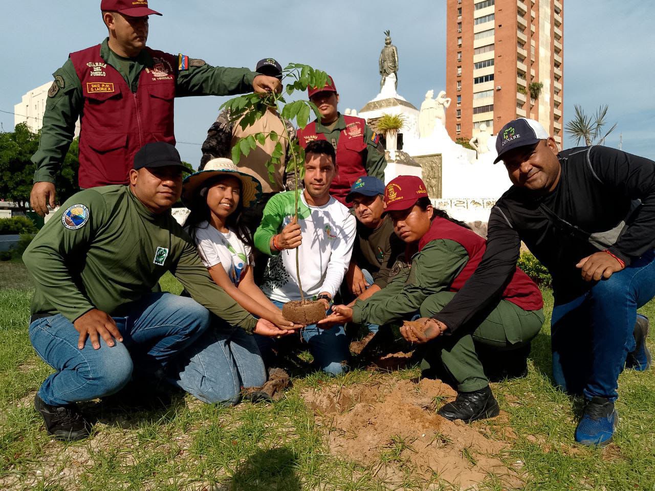 Trabajadores del Ministerio del Poder Popular para el Ecosocialismo (Minec) el estado Zulia, junto a efectivos de la Guardia del Pueblo realizaron una jornada de reforestación en la Plaza Cacique Mara, a propósito de los 532 años de Resistencia Indígena.