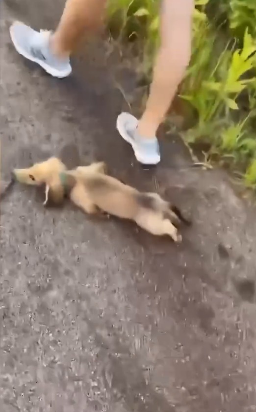 Durante un paseo, el tierno canino decidió tenderse en el suelo, aparentando estar agotado, con la esperanza de que sus dueños lo cargaran.