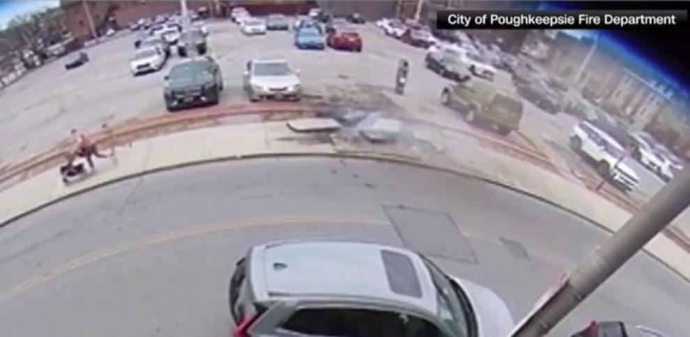 Un impactante video capturó el momento en que una mujer y dos niños se salvaron por escasos segundos de una violenta explosión de una alcantarilla en Poughkeepsie, Nueva York.