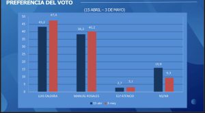 Los resultados son del trabajo de campo realizado entre el 29 de abril y el sábado 3 de mayo en un universo de 1.200 entrevistas a votantes zulianos inscritos en el registro electoral.