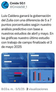 Con más de 4 puntos de diferencia por encima del candidato de la oposición Manuel Rosales, el Centro de Medición e Interpretación de Datos Estadísticos (Cemide 5.0), a 20 días de las elecciones, da como ganador a Luis Caldera a la Gobernación del estado Zulia.