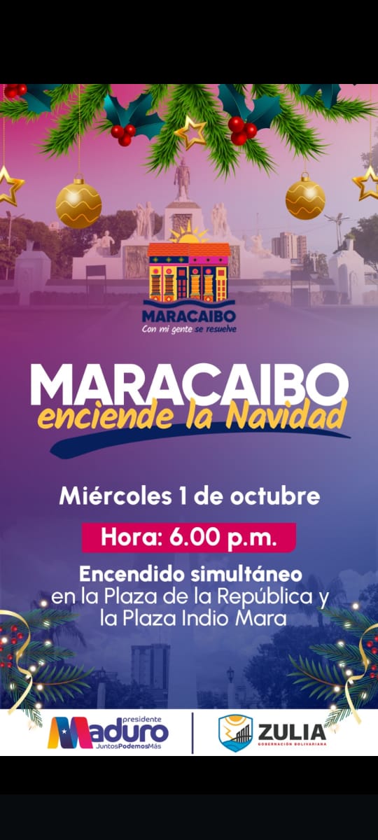 La ciudad de Maracaibo dará inicio a la temporada decembrina este miércoles 1 de octubre con un acto simultáneo en la Plaza de la República y la Plaza Cacique Mara, a partir de las 5:00 p.m. La actividad forma parte de la campaña “Juntos Podemos Más”, impulsada por la Gobernación del Zulia.