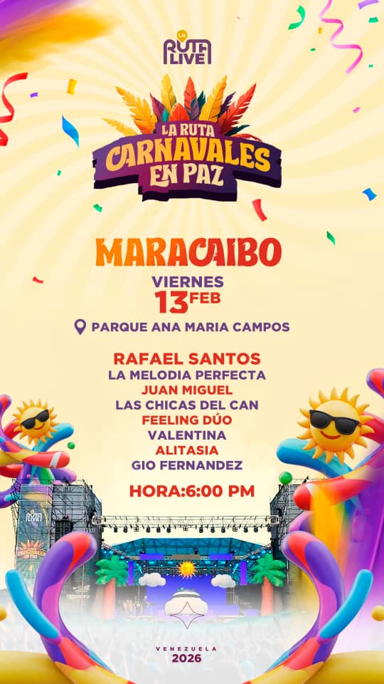 Artistas nacionales e internacionales animarán este viernes 13, la Ruta de Carnavales en paz en el Parque Monumental Ana María Campos, organizado por la Alcaldía Bolivariana de Maracaibo para el disfrute de la familia marabina.